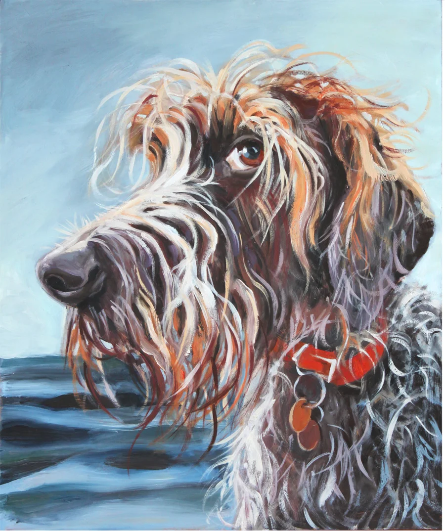 I first met Margaret on Instagram! I was totally taken by these water-loving German Wirehaired Pointers, and I had to paint her. Margaret lives on the lakes in the north of the US in Michigan. She has a charmed life exploring the forests and lakes near her home with her dog pal Shadow, which is lovingly recorded on her Instagram account 2cream2sugar. And the name... Margaret, has been a family name for generations in my family... for humans though, not for dogs!